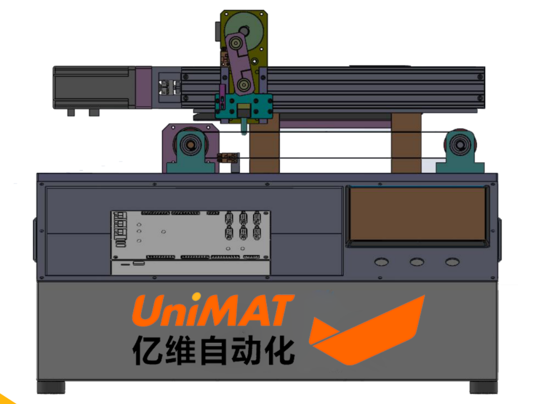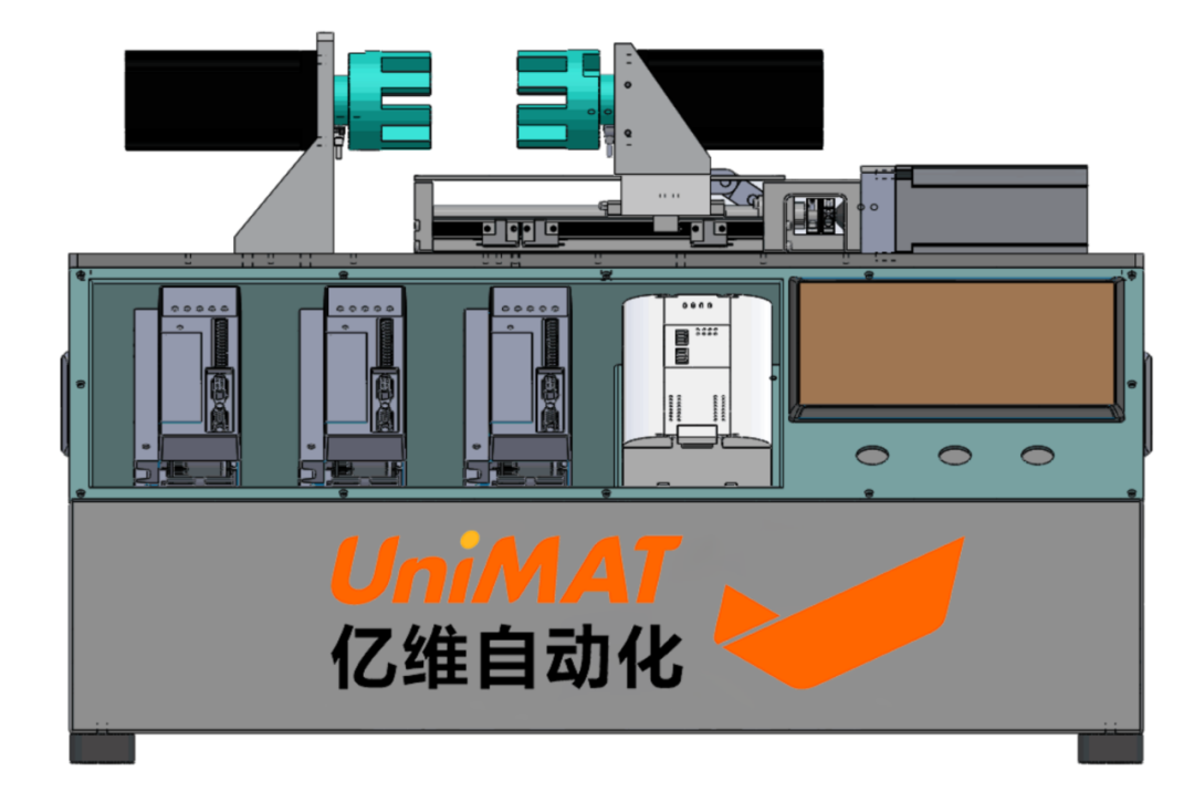 追剪平台由亿维运动控制器、EtherCAT伺服、触摸屏UH407及相关机械结构等组成,模拟了管材、型材等定长切割的应用现场。皮带由伺服电机A驱动,模拟现场中管材的连续输出;模组模拟刀架,有伺服电机B驱动;曲轴模拟切刀。由伺服电机C驱动。追剪运动过程中,皮带连续转动,模组经过加速,到达皮带的运行速度,速度同步后,曲轴电机运行一定的角度,模拟切刀剪切动作;剪切完成后,模组工作台高速返回原点,等待下一次的剪切,如此往复运动。 系统特点: 丨高精度 丨工作效率高 丨电气功率相对降低,性价比高 3.同步平台